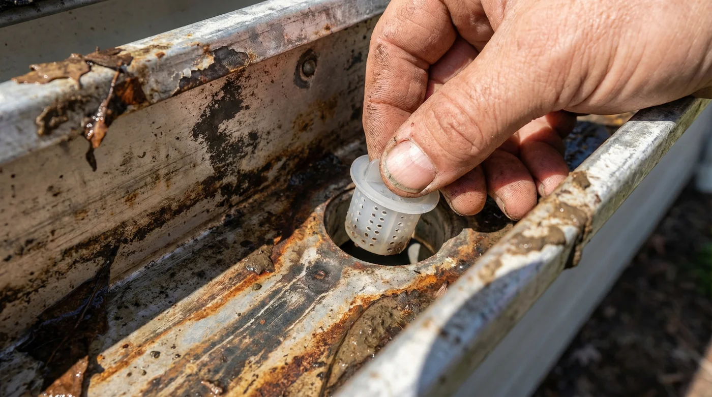 Pero la realidad de la física del agua es muy distinta. El verdadero problema no es que caigan hojas, sino cómo el sistema traga el volumen repentino de agua. Un tubo de bajada completamente abierto invita al caos, permitiendo que un gran bloque de residuos viaje y se atasque en el codo más inaccesible del ducto.
