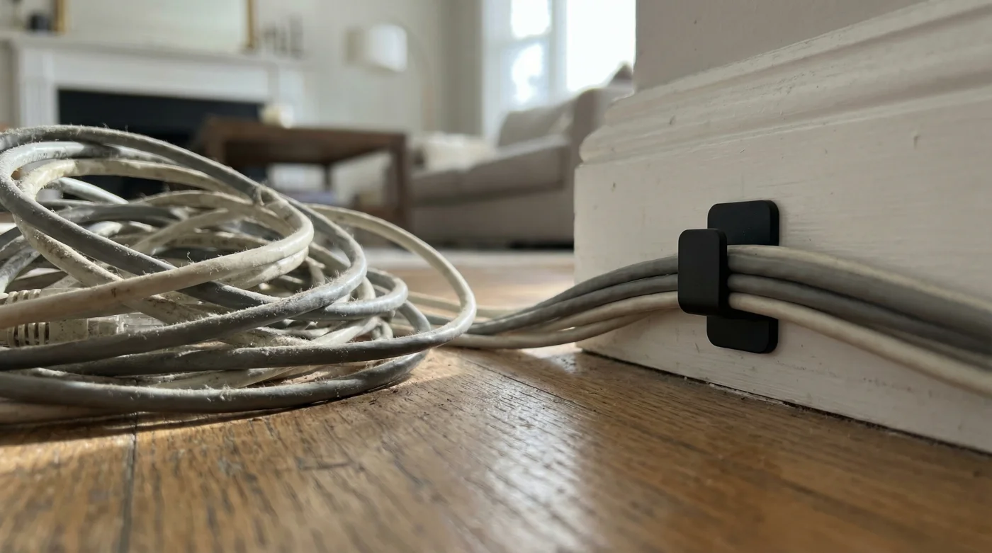 Existe una alternativa que no exige sacrificar la estética de tu apartamento rentado ni te obliga a vivir en un rincón de trabajo desordenado. Imagina que en lugar de esconder el problema bajo una costra de plástico barato, pudieras guiar esa conexión de alta velocidad usando pequeñas pinzas que se camuflan como detalles arquitectónicos en miniatura.