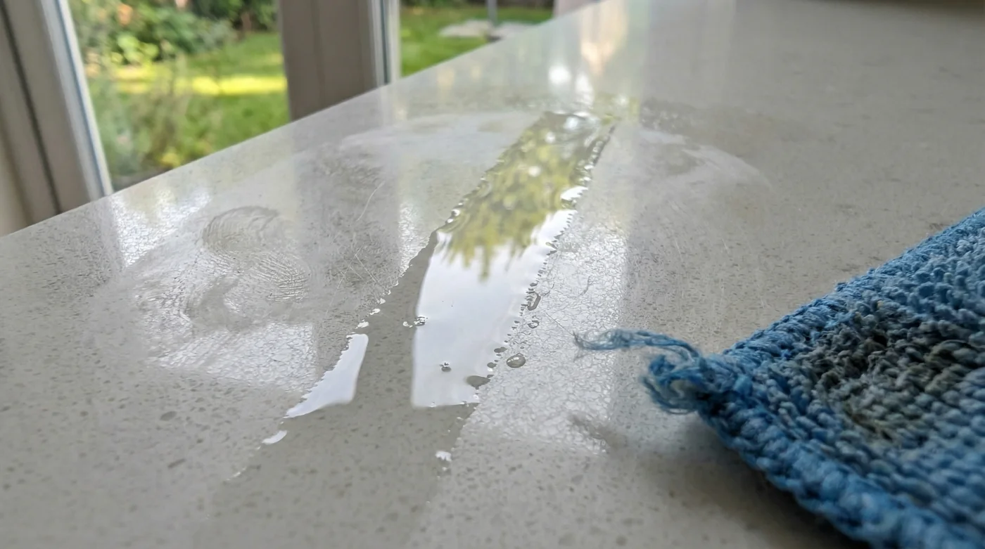Para el perfeccionista matutino, el enemigo es el agua dura y el exceso de celo. Si te desesperan las marcas cerca del lavaplatos y usas desengrasantes industriales diarios, estás quemando la capa protectora del cuarzo. Esa falta de brillo que ves no es suciedad, es pura deshidratación química.