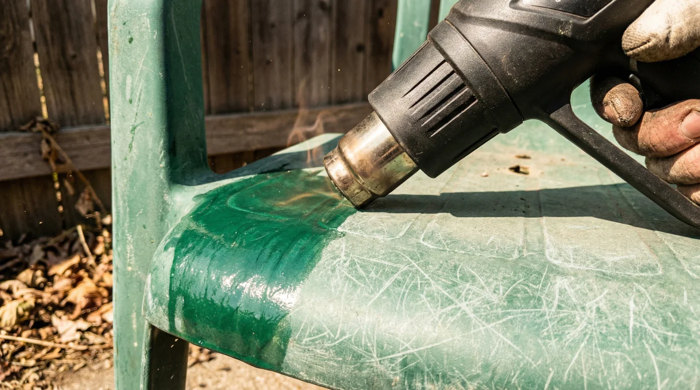 Aquí es donde la pistola de calor cambia las reglas del juego por completo. Al aplicar una temperatura constante y controlada, esa capa de polvo calcáreo se funde, reorganizando las moléculas y sellando la superficie con el plástico virgen que estaba debajo.