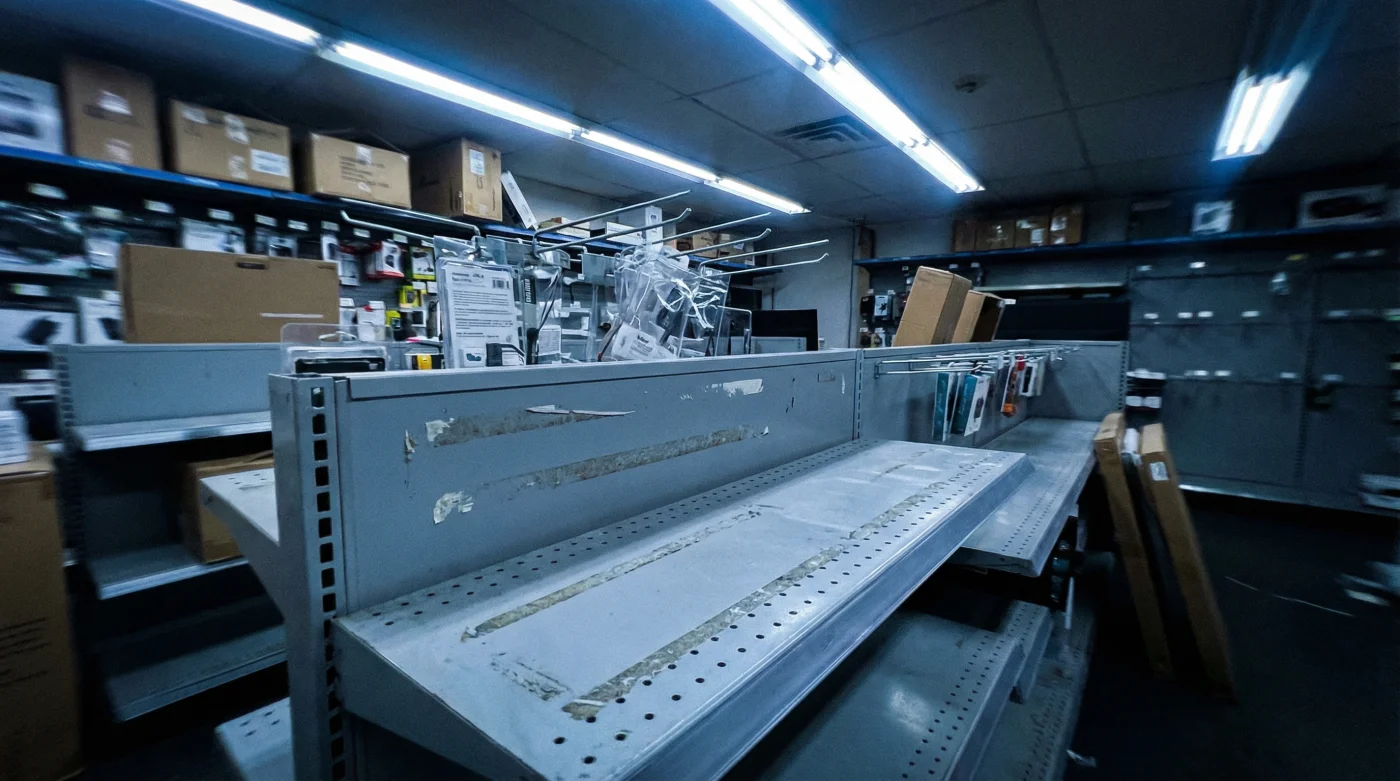 Pero al llegar al pasillo de electrónicos, te encuentras con un vacío inquietante. Ganchos metálicos totalmente desnudos te reciben bajo la luz fluorescente, mientras otros vecinos murmuran con frustración, mirando sus teléfonos.
