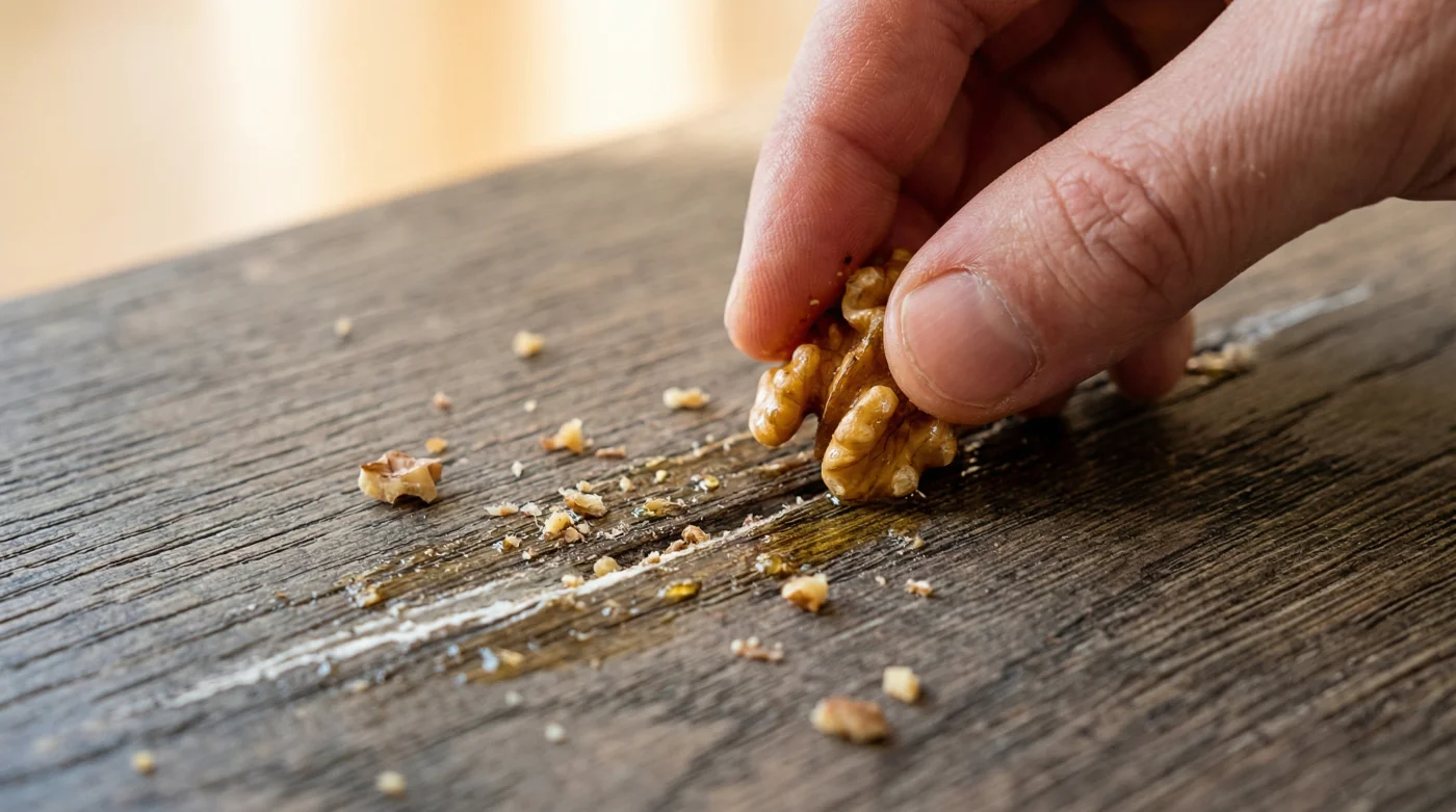 - El ángulo de fricción: Frota la cara húmeda de la nuez directamente sobre el rasguño, moviendo tu mano con presión muy firme en un ángulo de 45 grados respecto a la línea del daño, obligando mecánicamente al aceite a entrar.