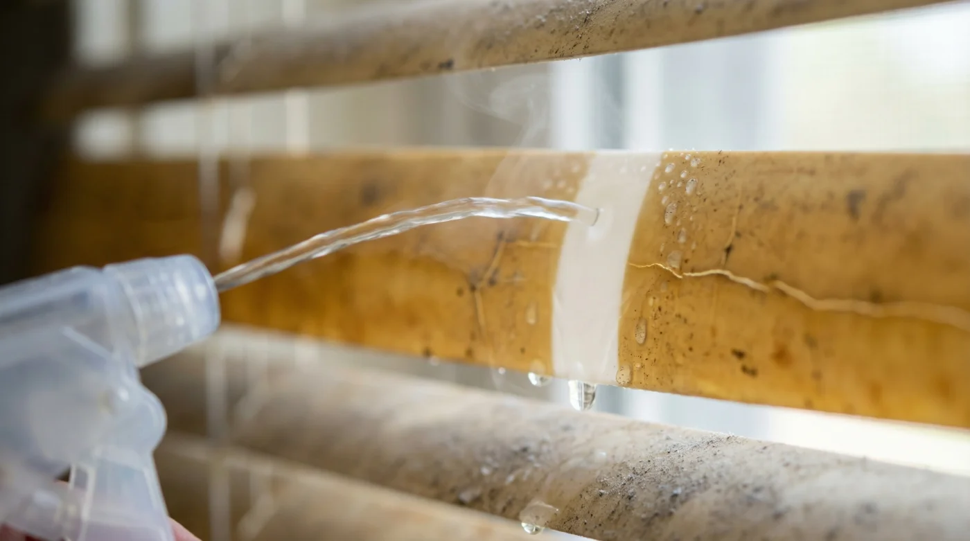 Si estás trabajando con las persianas de una cocina muy activa, el tono amarillento suele ser una mezcla compleja de fotodegradación y cochambre pegajoso. Aquí, la solución líquida necesita un tiempo de reposo considerablemente más largo para penetrar ambas capas. En cambio, si las persianas pertenecen al baño, la humedad diaria ya ha hecho parte del trabajo pesado de ablandar la superficie, permitiendo que el vinagre actúe casi de inmediato sin necesidad de aplicar fricción extra.