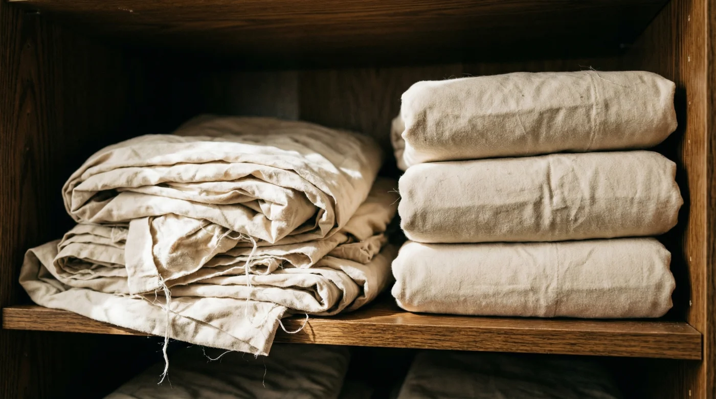 Para el minimalista urbano: Vives en un apartaestudio donde cada centímetro de almacenamiento cuenta. Al convertir tus sábanas en pequeños ‘ladrillos’, puedes almacenarlas verticalmente en un cajón profundo de la cómoda o en un cesto de mimbre, estilo archivo de oficina. Ganas un espacio visual tremendo y permites que las fibras naturales respiren adecuadamente.