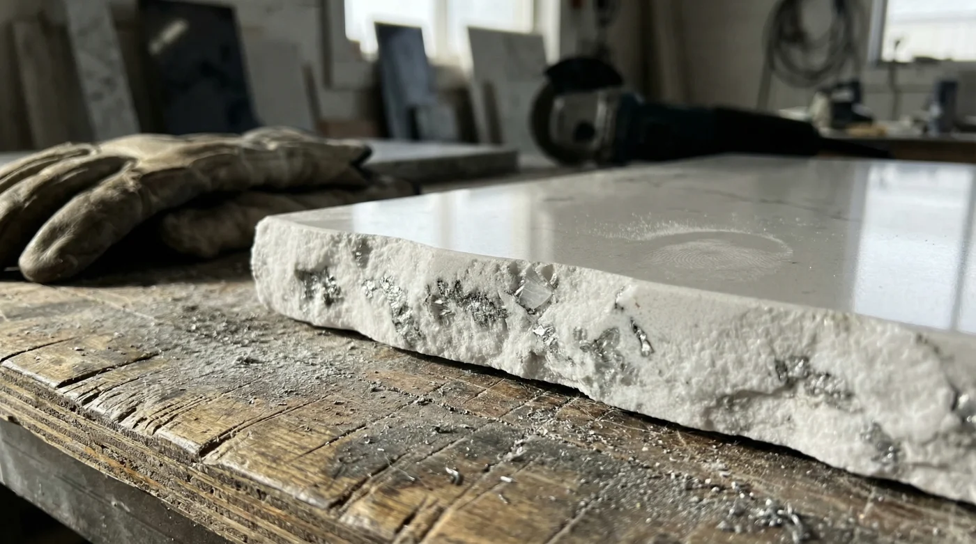 Piénsalo como si compraras un árbol gigante solo para sacar tres tablas. Los retazos industriales, esas piezas de cuarzo para cocinas que quedan de los grandes proyectos comerciales o de las enormes casas a las afueras de la ciudad, terminan apilados, llenos de polvo, en el fondo de las marmolerías locales.
