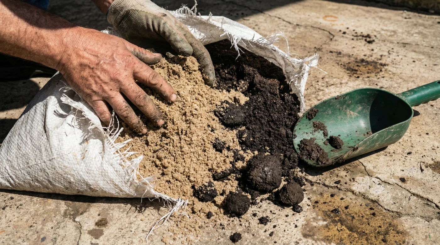 - El amasado en seco: Sobre un plástico grande, vierte tu compost oscuro y tu arena seca. Usa una pala de mano pequeña o tus propios dedos para integrar todo el volumen. La mezcla final debe sentirse maravillosamente ligera; si la aprietas en un puño, debe formar un terrón que se desmorona de inmediato con un toque ligero.