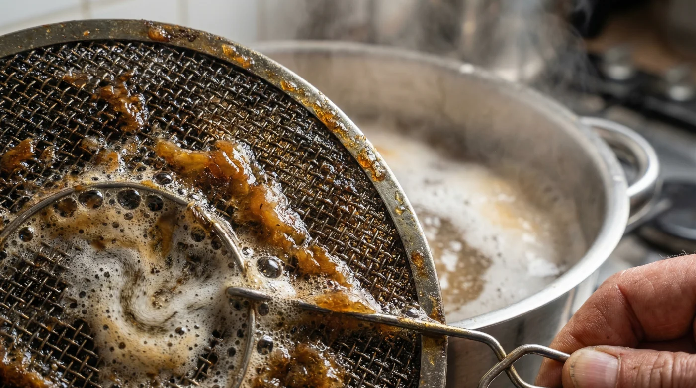 Al levantar la pieza metálica del líquido turbio, notarás de inmediato que la cuadrícula respira libremente. Los agujeros microscópicos, antes sellados por el hollín y la manteca condensada, ahora dejan pasar la luz con total claridad visual.