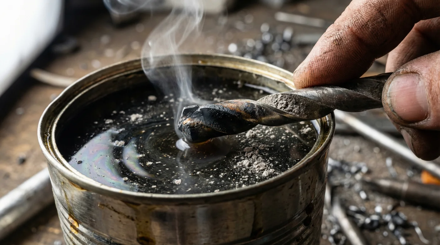 Aquí es donde la rutina de mantenimiento cambia drásticamente. El secreto para no gastar una fortuna en ferreterías no está en presionar más fuerte el taladro con el peso de tu cuerpo, sino en entender y dominar la temperatura. Sumergir la punta caliente de la broca en un fluido de corte estándar para metales mientras perforas altera por completo el destino de tu herramienta, preservando su vida útil hasta tres veces más.