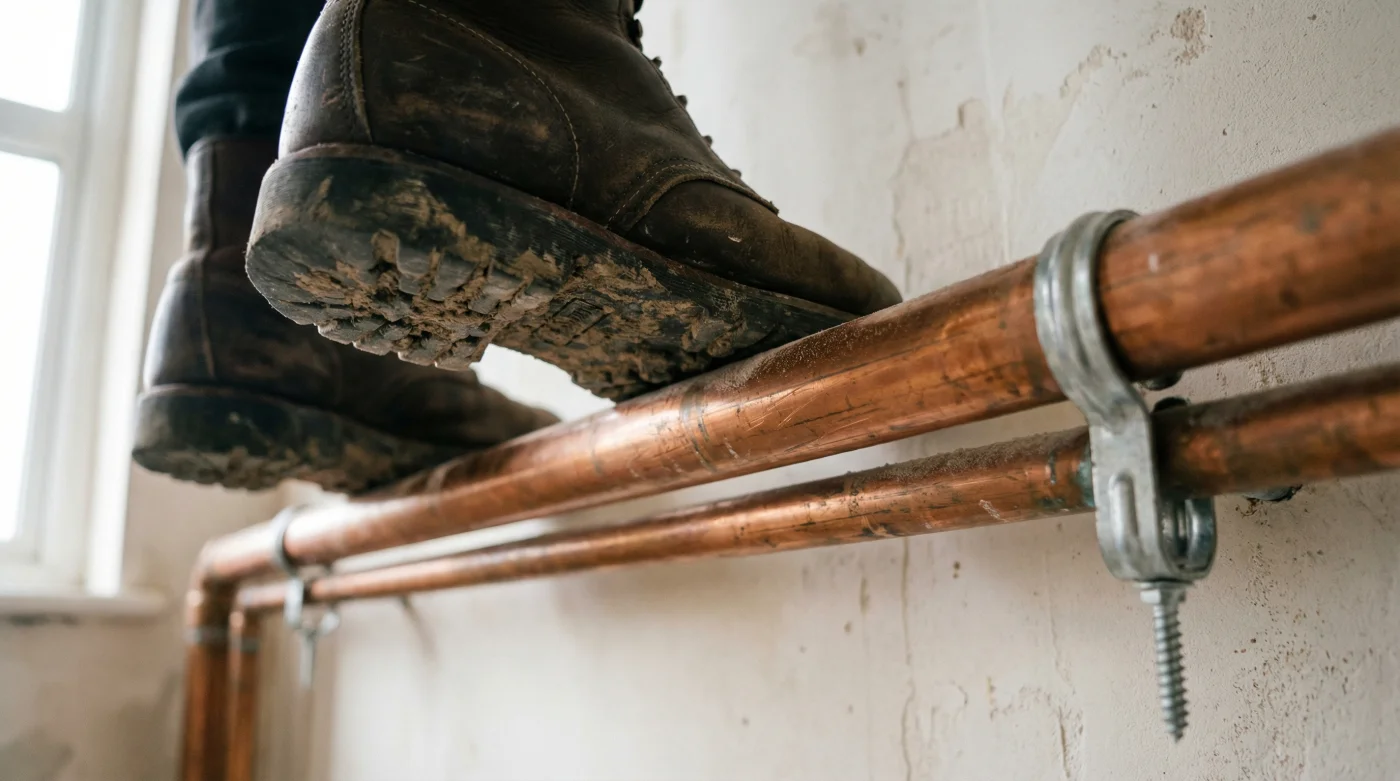 La idea de que los tubos de cobre son exclusivamente venas ocultas que transportan agua es un desperdicio de su potencial estético. Cuando sacas este material de la oscuridad de las paredes y lo expones a la luz, el cobre deja de ser plomería para convertirse en una pieza de diseño de alta gama. Anclar tubos paralelos de media pulgada directamente a la pared de tu clóset no solo es un acto de rebeldía contra los muebles voluminosos, es la creación de una estructura flotante elegante que transforma por completo la gravedad de tu espacio.
