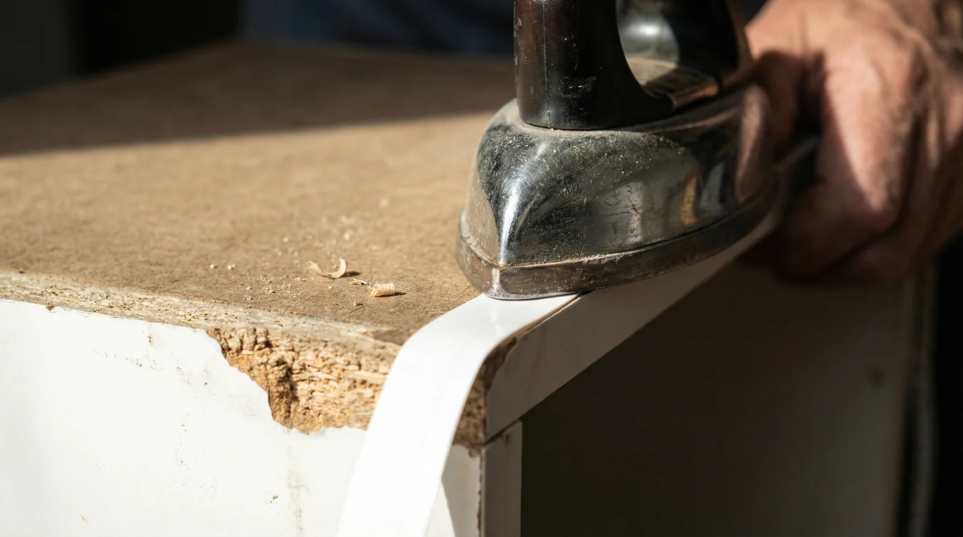Conecta tu plancha de ropa y apaga cualquier función de vapor. Aquí necesitamos un calor seco y constante. Ajusta la temperatura a un nivel medio-alto (usualmente la marca de algodón). Coloca la cinta de cantos sobre el borde desnudo. Con movimientos lentos y una presión firme, pasa la plancha caliente sobre la cinta. Inmediatamente sentirás cómo el pegamento comienza a ceder bajo el metal, abrazando la madera prensada.