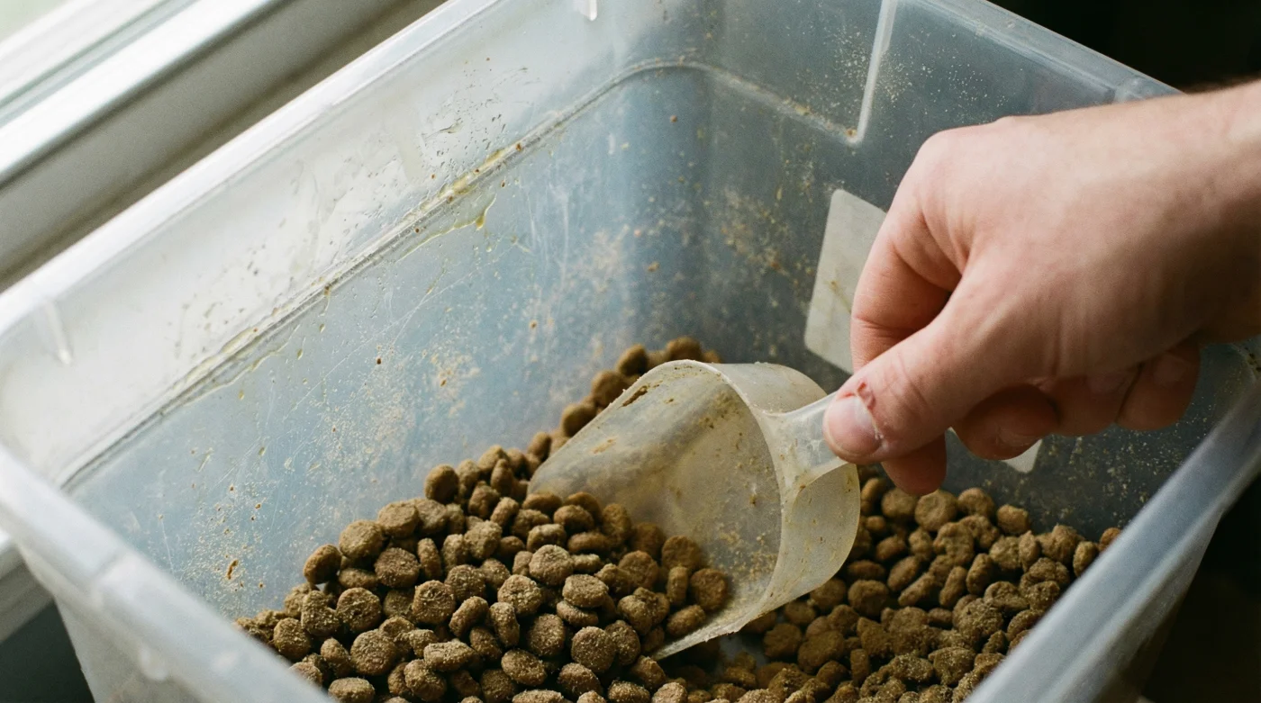 Escuchas el sonido satisfactorio de las croquetas cayendo como una cascada seca dentro de ese contenedor de plástico gigante. Te costó unos 45.000 pesos en una tienda local y sientes que por fin le has puesto orden a la despensa. Cierras la tapa hermética con un golpe seco, convencido de que estás blindando la frescura de la comida para perros. Sin embargo, si prestas atención al abrir ese mismo recipiente un par de semanas después, notas un olor distinto. Un rastro sutil a aceite pesado, casi a pintura vieja. Ese aroma no es el curso natural de los ingredientes madurando. Es el sonido silencioso de un colapso nutricional. Al vaciar el alimento directamente, le estás quitando a tu perro exactamente lo que pagaste por darle.