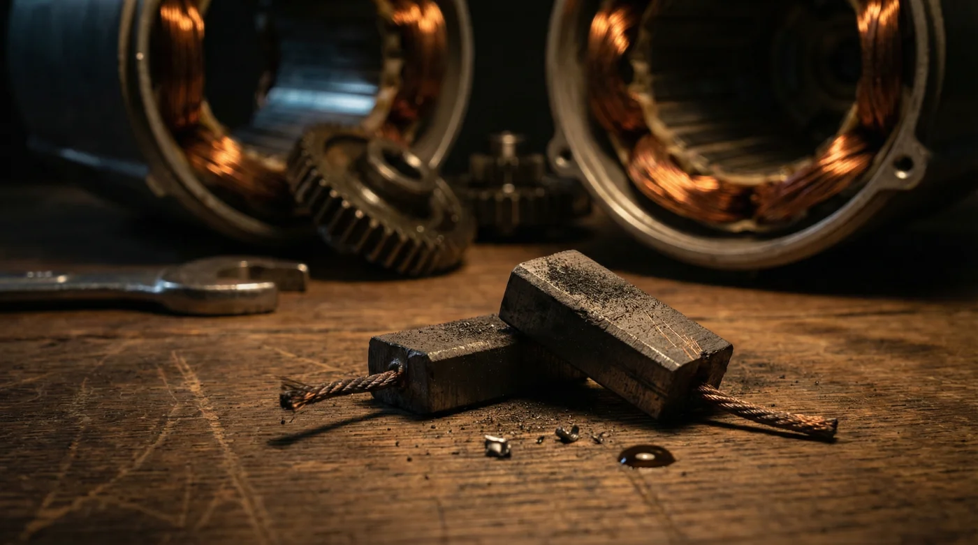 Pero la realidad mecánica es mucho más terrenal y enteramente reparable en la mesa de tu casa. Imagina que estas pequeñas piezas son el sistema circulatorio eléctrico de tu máquina. Las escobillas de carbón son pequeños bloques grises diseñados para rozar constantemente contra el colector del motor, entregando la chispa exacta que hace girar el engranaje.