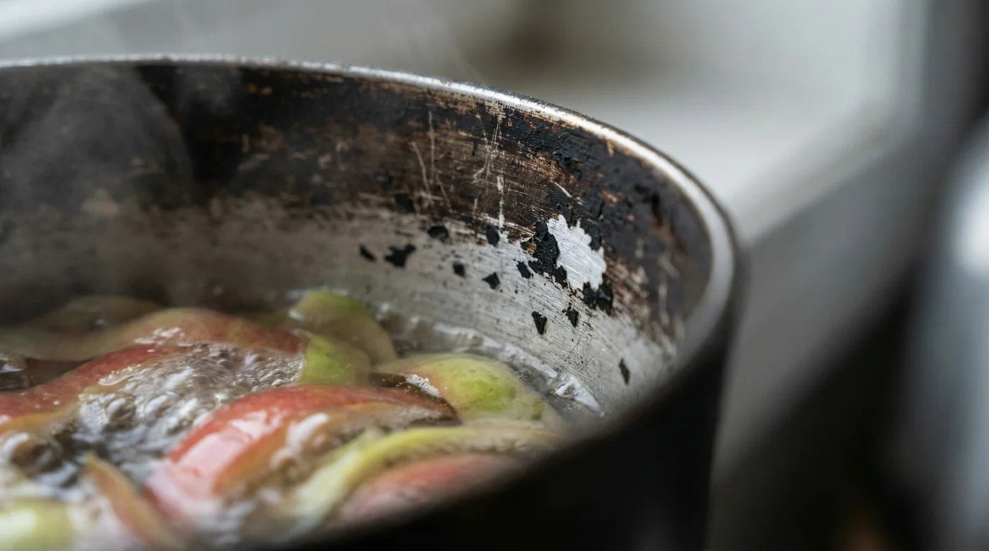 - Apaga el fuego. Deja reposar la olla en la parrilla hasta que el agua esté apenas tibia al contacto. Retira y desecha las cáscaras compostables, bota el agua oscura, y simplemente pasa una esponja suave de espuma tradicional con una gota de jabón lavaplatos. La oxidación se desprenderá al tacto como si fuera polvo fino.
