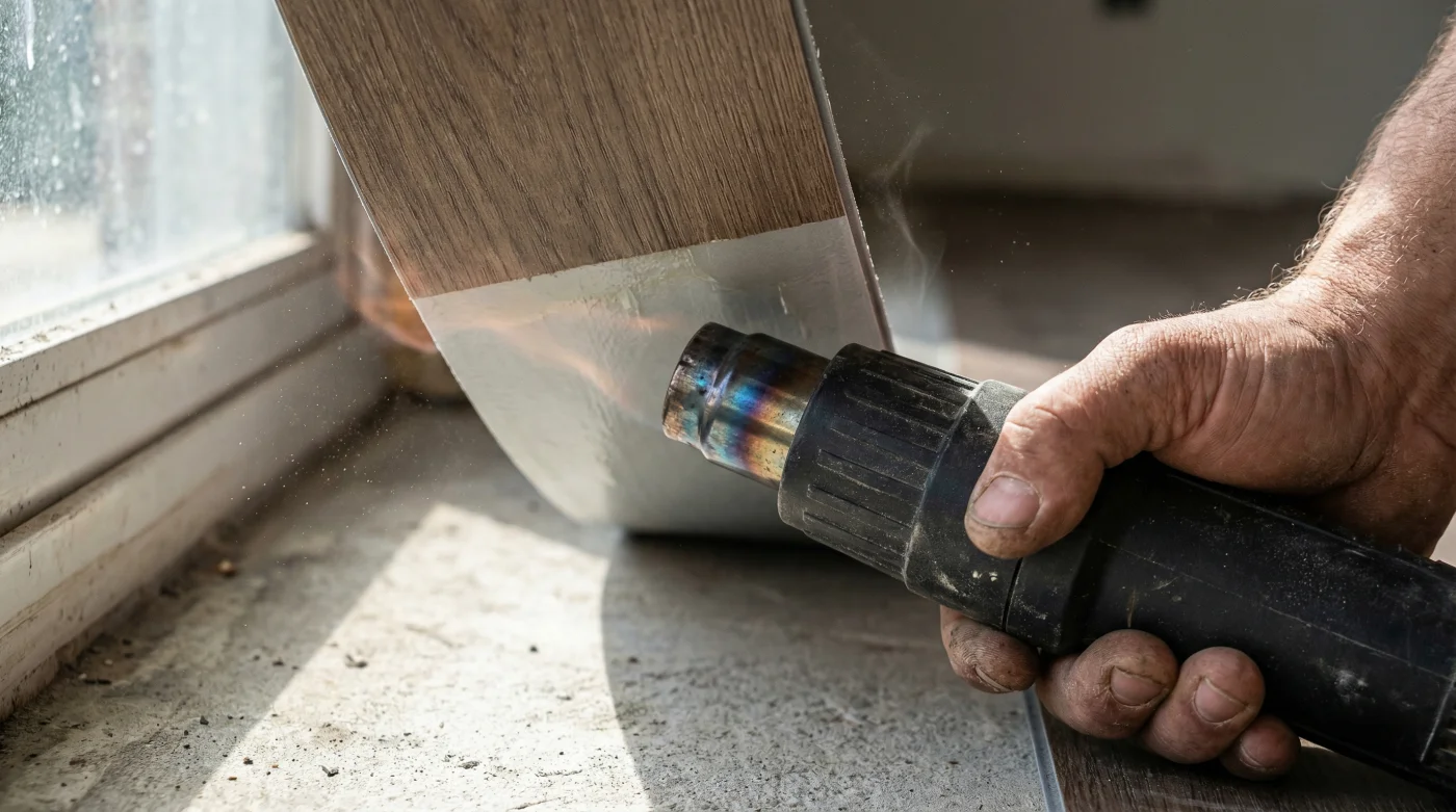 Coloca la palmeta caliente exactamente en su posición. Usa un trapo limpio para presionar desde el centro hacia los bordes, expulsando cualquier burbuja de aire. A medida que el vinilo vuelve a la temperatura ambiente, se encoge microscópicamente, creando un efecto de succión contra el piso viejo que rivaliza con cualquier pegamento comercial.