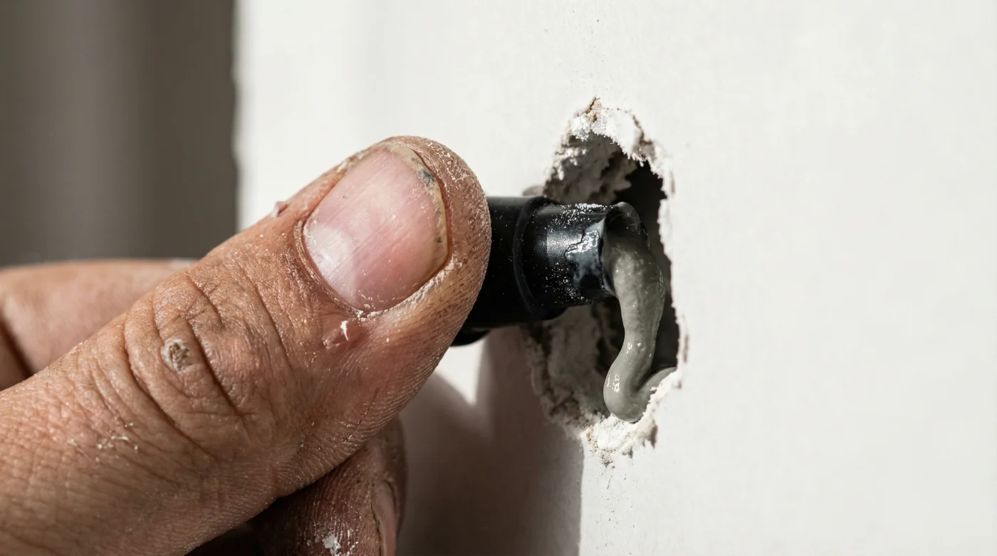 Este tamiz es vital para el milagro físico: es un cilindro hueco y perforado que evitará que el líquido caiga al piso entre las paredes. Lo insertas suavemente hasta que el pequeño borde exterior quede al ras de la placa de yeso. Luego, preparas el cartucho de resina en tu pistola aplicadora.