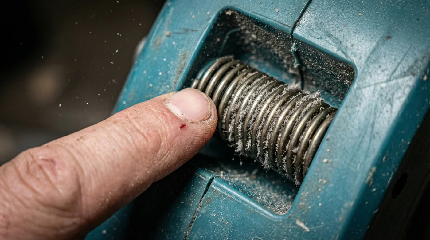 Toma una lata de aire comprimido o la boquilla fina de tu compresor. No lances una ráfaga continua. Utiliza soplados cortos y secos, dirigiendo el aire directamente hacia el interior de la carcasa del resorte. Verás salir una nube densa de partículas compactadas que parecen cemento. Este polvo acumulado es el que estaba endureciendo el recorrido. Mientras aplicas el aire, mueve suavemente la guarda hacia arriba y hacia abajo con tu mano libre. Sentirás cómo la resistencia pastosa desaparece gradualmente, dando lugar a un movimiento fluido y mecánico.
