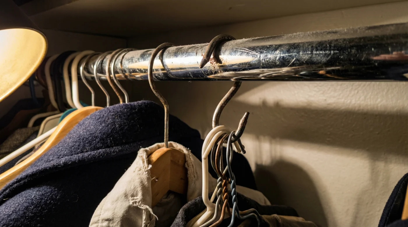 Empieza vaciando un sector de tu tubo principal. Pasa un paño apenas húmedo para quitar el polvo grisáceo acumulado. Siente el peso de tu ropa y clasifícala por el rigor de sus telas: camisas ligeras a un lado, jeans pesados al otro. Toma tu primer gancho tipo S. En lugar de colgarlo de frente, levanta tu muñeca, pásalo por encima del tubo y engancha la curva desde atrás hacia tu dirección. Notarás que requiere un ligero ángulo y un esfuerzo extra para entrar, pero esa resistencia inicial es exactamente la fricción que evitará que te traicione después.