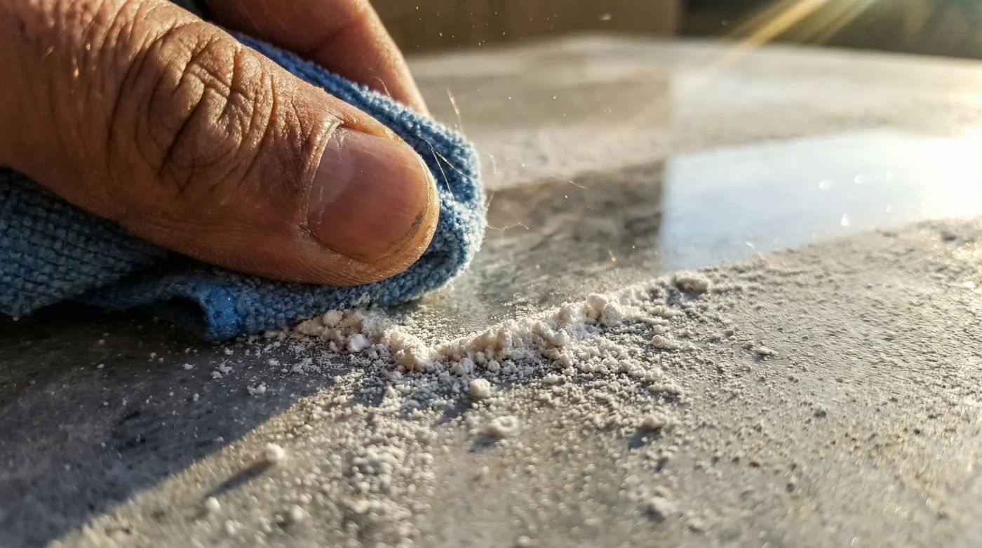 Tu caja de herramientas táctica: No necesitas comprar un arsenal entero para dominar esta tarea en casa. Solo busca polvo mineral puro (revisa rigurosamente la etiqueta para evitar aquellos con maicena, que alimentan hongos con la humedad ambiental), un paño de microfibra de trama muy cerrada, y trabaja en mañanas frescas, rondando los 18°C. Si el piso está caliente por el sol del mediodía, la fricción seca se vuelve errática, pegajosa y enormemente frustrante.