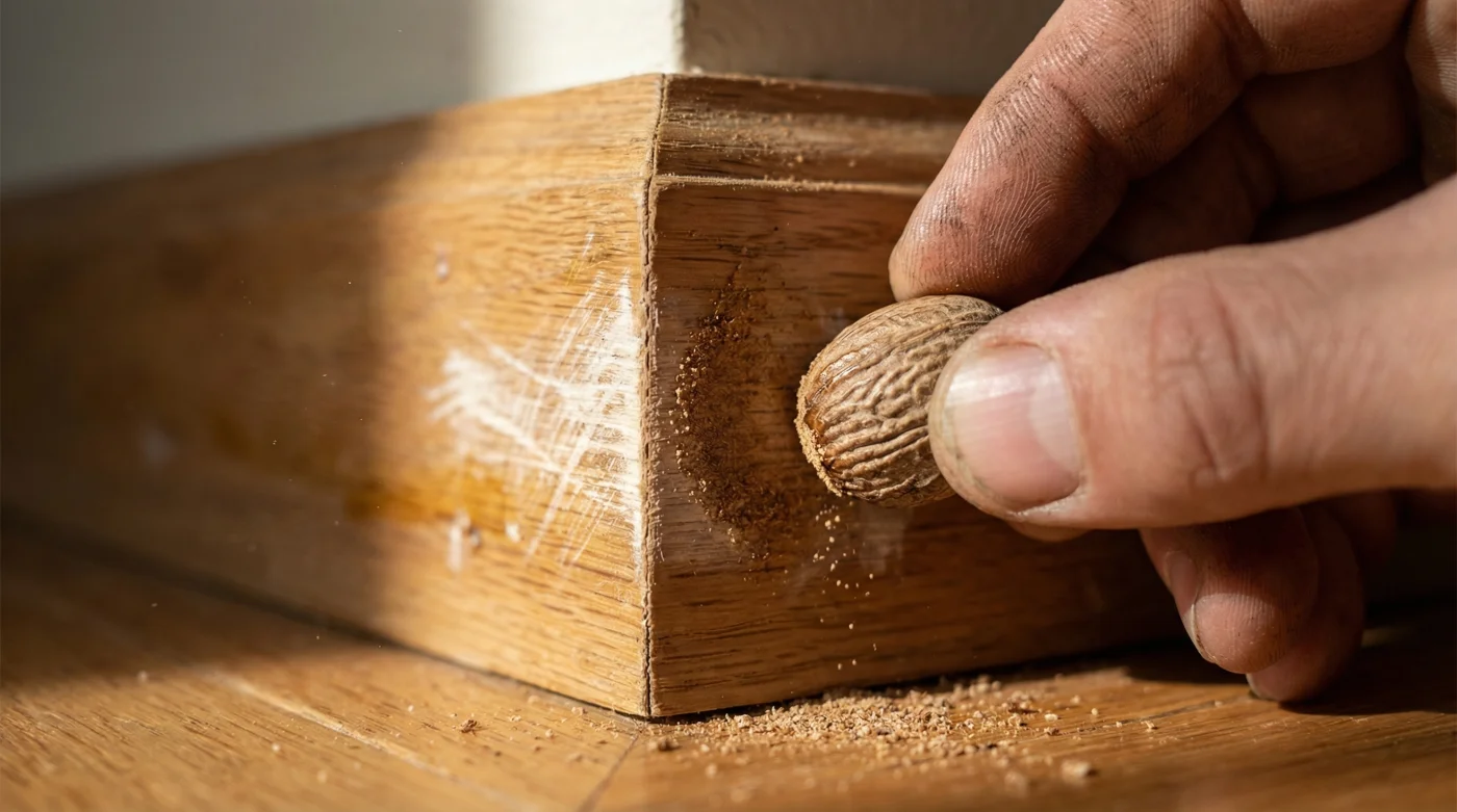 La nuez moscada, por el contrario, actúa rellenando el daño estructuralmente. Esta semilla está cargada de ácido mirístico y aceites esenciales. Cuando la friccionas contra la marca del golpe, el calor generado derrite esos lípidos naturales, empujándolos dentro de las grietas microscópicas de la madera y tiñéndolas de un tono cálido y orgánico.