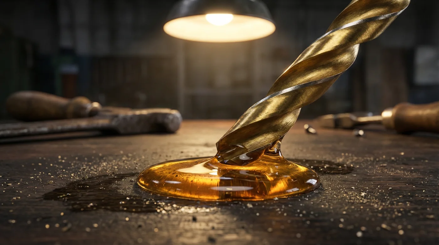 Aquí entra el aceite estándar. Sí, ese mismo lubricante espeso que usas para el cambio rutinario de los 10.000 km. Al mojar la punta antes de cada agujero, estás creando un colchón microscópico protector. El líquido no solo enfría el punto de contacto, sino que envuelve la viruta afilada y evita que la fricción seca muerda y destroce los canales de corte. De repente, la supuesta debilidad térmica de la herramienta se convierte en tu mayor ventaja de precisión.