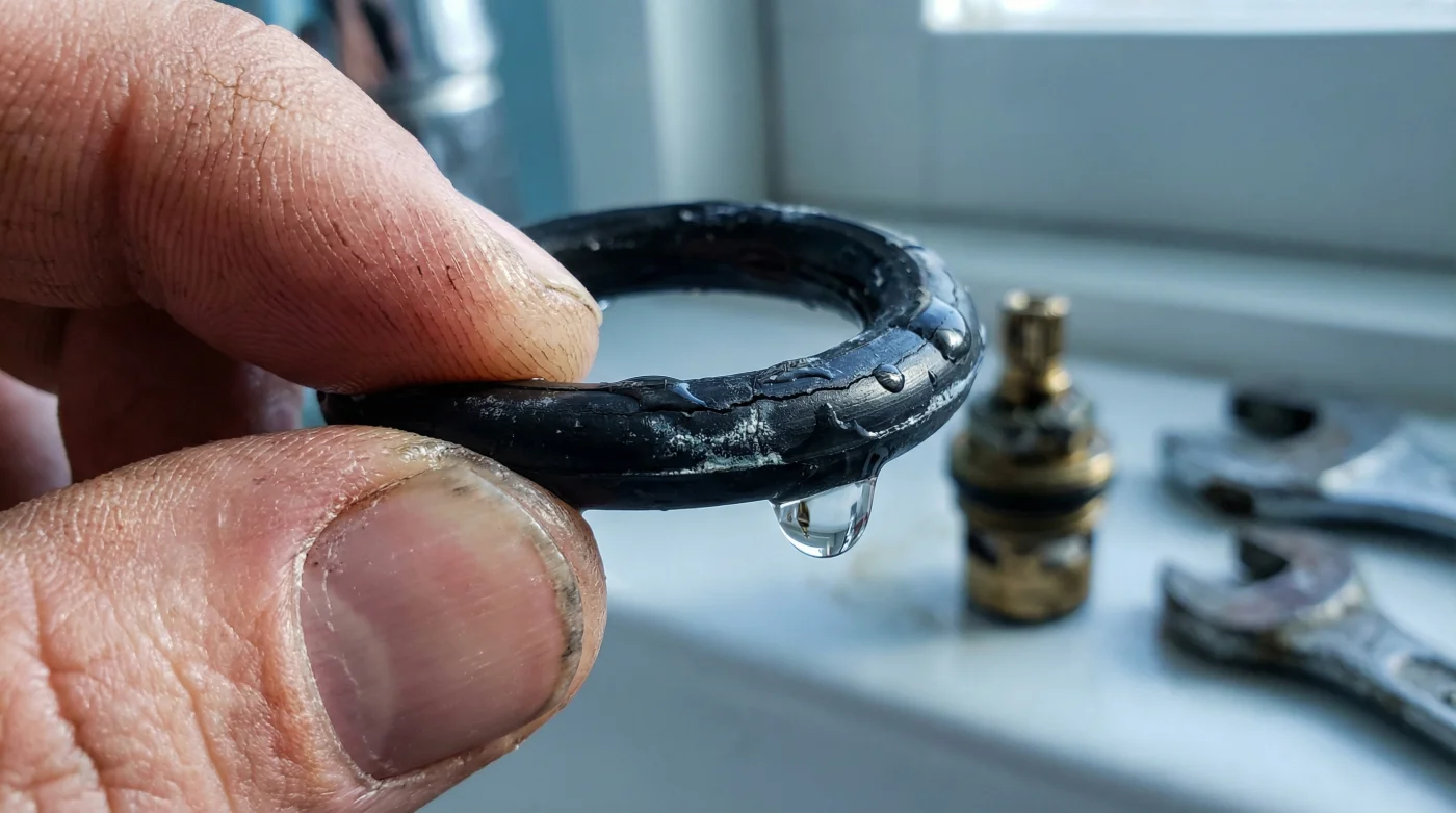 | Deformación (El origen del goteo) | Años de apretar la manija crean un surco de 1 a 2 milímetros en la cara expuesta de la goma. El agua capilar encuentra una salida. |
