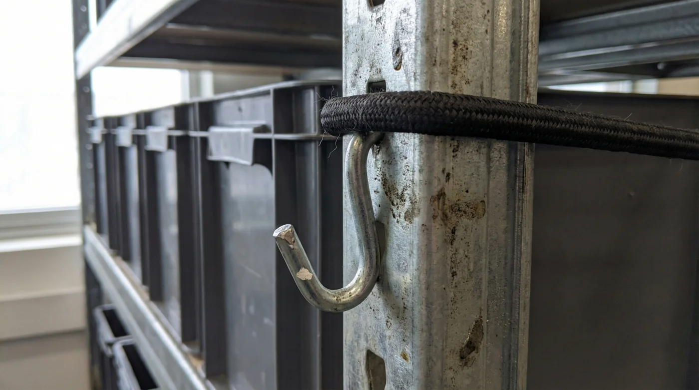 No había tablas de triplex atrás, ni mallas costosas. Mientras me entregaba una pieza, noté el truco. “Una repisa sin tensión es un saco roto”, me dijo, estirando una cuerda elástica gruesa y negra que cruzaba de un pilar al otro. Esa simple línea oscura, repetida en cada nivel del estante, actuaba como una barrera rígida pero amable. Las cajas de almacenamiento topaban contra el elástico, creando una cuadrícula visual perfecta y unificada.