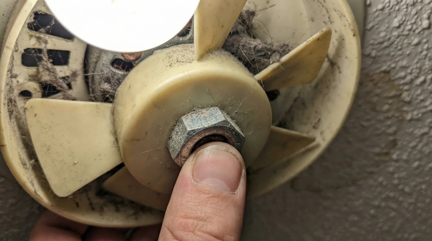 Piensa en el ventilador de tu baño como el volante de un carro a alta velocidad. Si una sola tuerca pierde tensión, la vibración no se queda contenida en el centro; viaja, se amplifica contra el armazón de plástico y convierte la estructura del techo en una caja de resonancia gigante. El enorme porcentaje del ruido ensordecedor que toleras proviene exclusivamente de la tuerca que sujeta las aspas al eje central del motor.