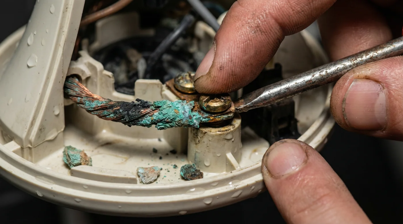 El metal ya no brillaba con ese naranja cálido característico del cobre sano. Estaba completamente opaco, rígido y cubierto por un polvo calcáreo color turquesa. El azufre presente en el agua potable, sumado a la humedad constante, se come el cobre con el tiempo, me explicó. Cuando el cable se sulfata de esta forma, pierde su capacidad de conducir los electrones de manera fluida. La energía choca, se acumula, busca una salida abrupta y genera el temido cortocircuito. Cambias este pequeño tramo de cable por apenas un par de monedas, y le devuelves años de vida útil a tu ducha.