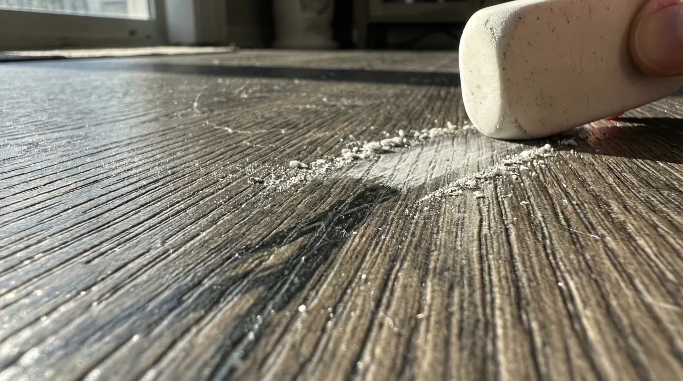 Tratar de disolver esa marca oscura con solventes es como intentar matar una mosca en la ventana de tu sala usando un martillo de construcción. Al cambiar tu enfoque hacia una fricción seca y controlada, entiendes que el polímero del borrador abraza la mancha, la envuelve en sus propias migajas y la retira enteramente del sistema sin herir el barniz de uretano.