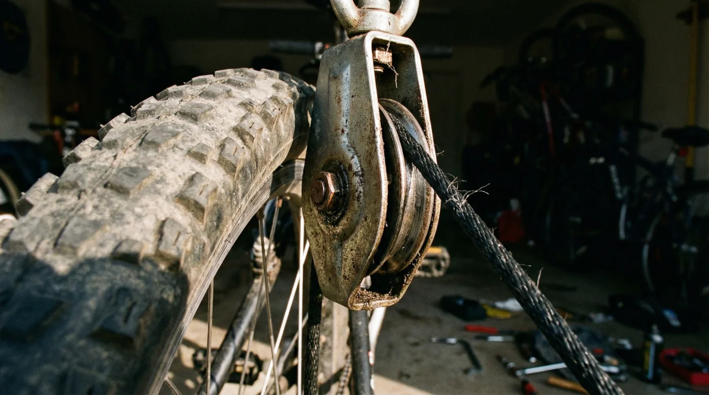 Un sistema de poleas colgantes altera literalmente la gravedad percibida de tu hogar. No se trata simplemente de colgar algo de un clavo; es una coreografía mecánica refinada que convierte veinte kilos de aluminio y caucho en una pluma flotante, elevando tu máquina a un santuario donde no estorba, no ensucia el piso y no sufre golpes accidentales.