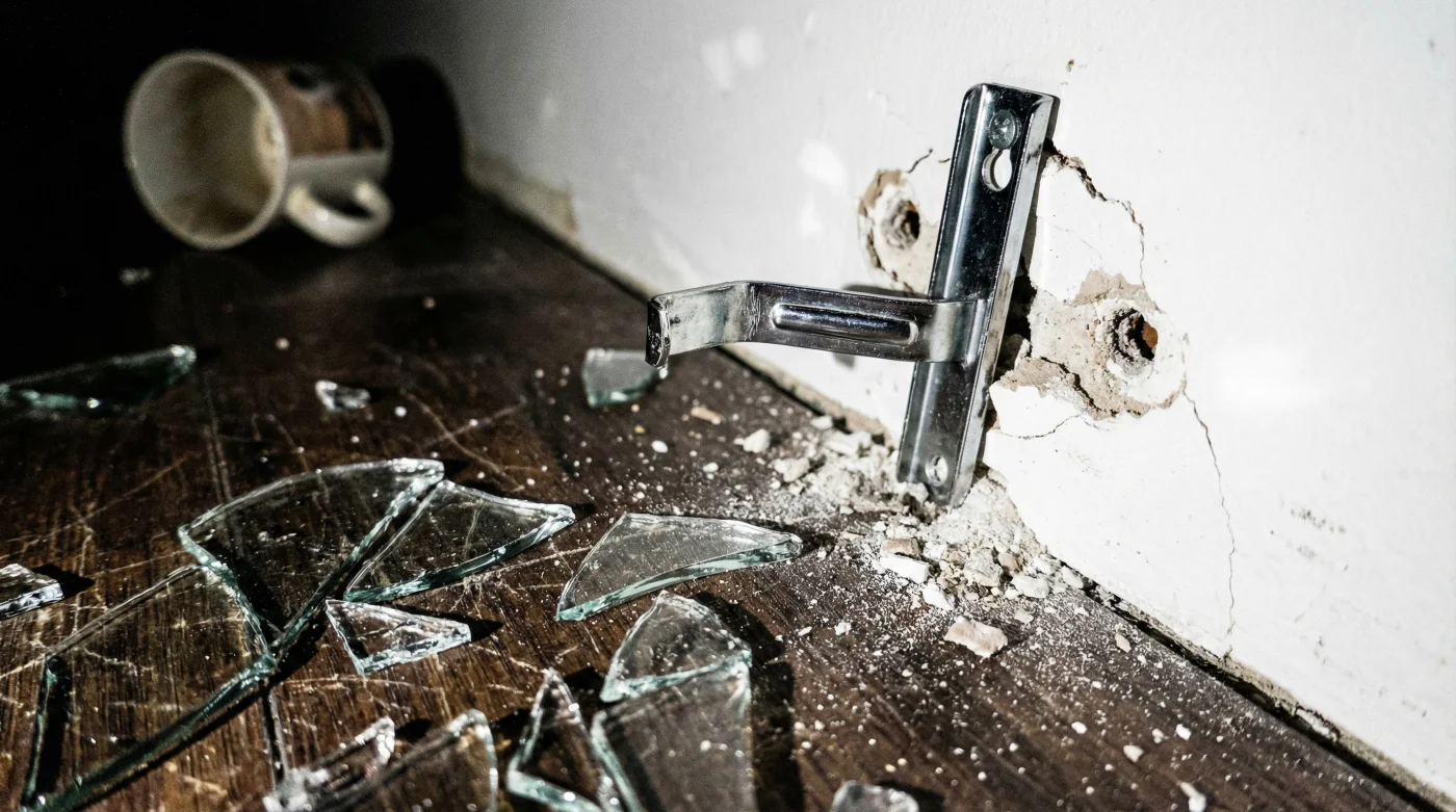 Para el purista del diseño que se niega a instalar ménsulas de acero grueso, la defensa reside en la inspección de torque y la amortiguación. Retirar el estante y adherir películas de poliuretano en la pinza del soporte evita que el vidrio resbale, incluso si el tornillo pierde media vuelta de agarre. Actúa como una red invisible protectora, absorbiendo la onda del sismo como si el cristal estuviera respirando a través de una almohada suave.
