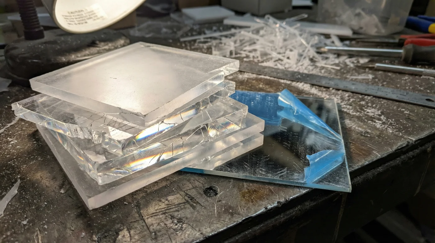 La industria del comercio y la publicidad necesita vitrinas, exhibidores de joyería, buzones corporativos y carteles luminosos. Para fabricar todo esto, los talleres compran acrílico en formatos gigantescos directamente de fábrica. Cuando la máquina corta el diseño principal, los bordes y paneles que sobran caen al piso. Estas piezas, a menudo del tamaño de una ventana pequeña, están hechas de polímeros de mucha mayor densidad que los de la ferretería barata, pero para el fabricante son solo un estorbo que ocupa espacio en su bodega de producción.
