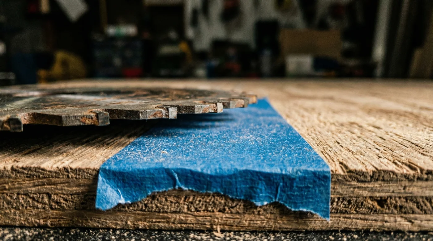 Aquí es donde ocurre el cambio de perspectiva. Al pegar una tira de cinta de enmascarar exactamente sobre la línea de corte, estás aplicando un principio físico fascinante: la tensión superficial. La cinta abraza las fibras frágiles, manteniéndolas firmes contra la placa base de tu sierra.