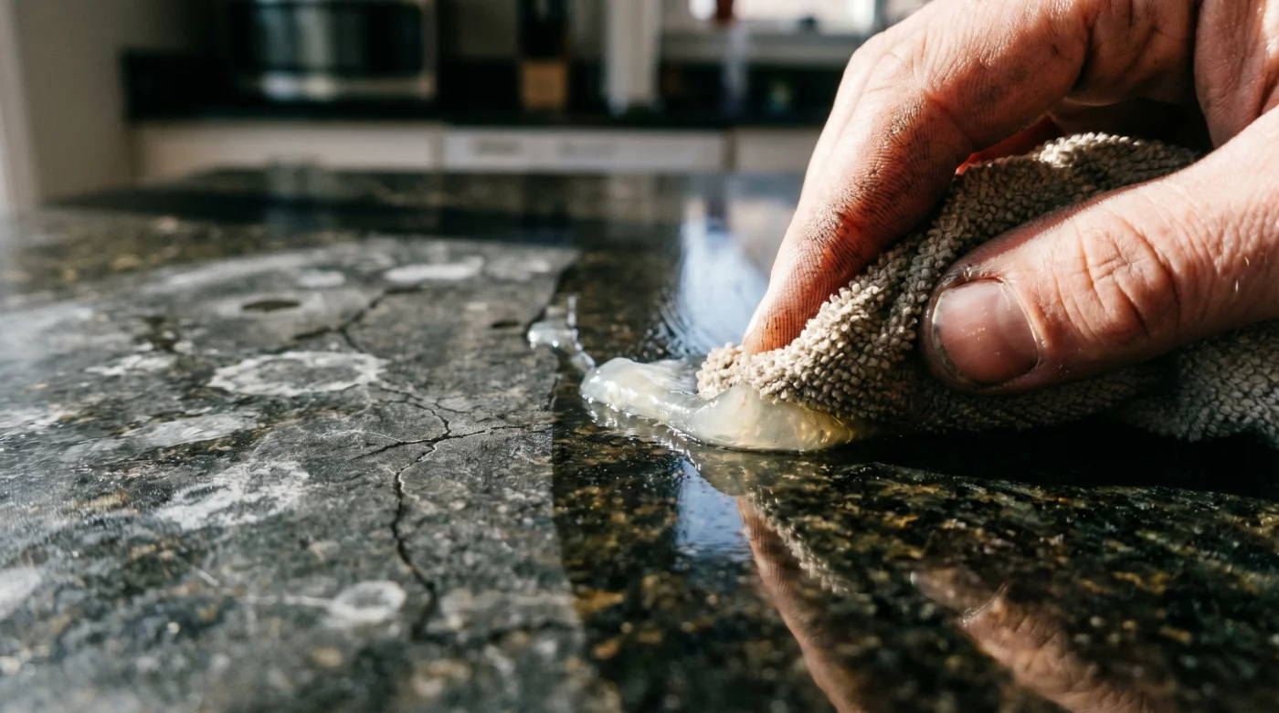 Entras a la cocina temprano. La luz de las seis de la mañana entra por la ventana y golpea la superficie de trabajo. En lugar de un reflejo limpio, ves esos anillos opacos dejados por el pocillo del tinto, huellas de limones exprimidos a medias y un velo grisáceo que apaga el color natural de la piedra. Pasar la mano por ahí ya no se siente como acariciar cristal, sino como tocar papel de lija fino.
