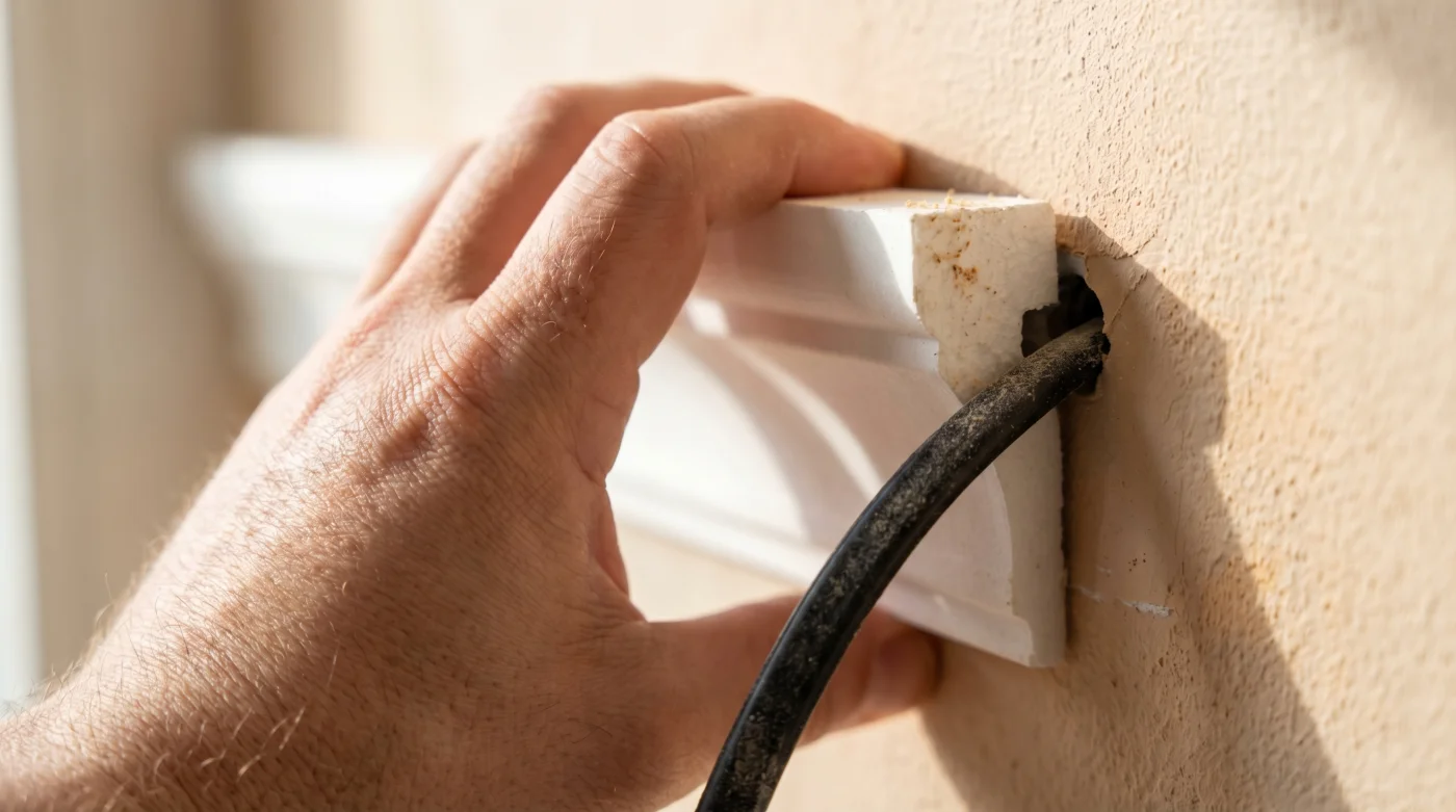 - Posiciona la moldura desde el piso hacia arriba, cubriendo los cables como si los estuvieras abrigando suavemente, y mantén presión firme durante treinta segundos.