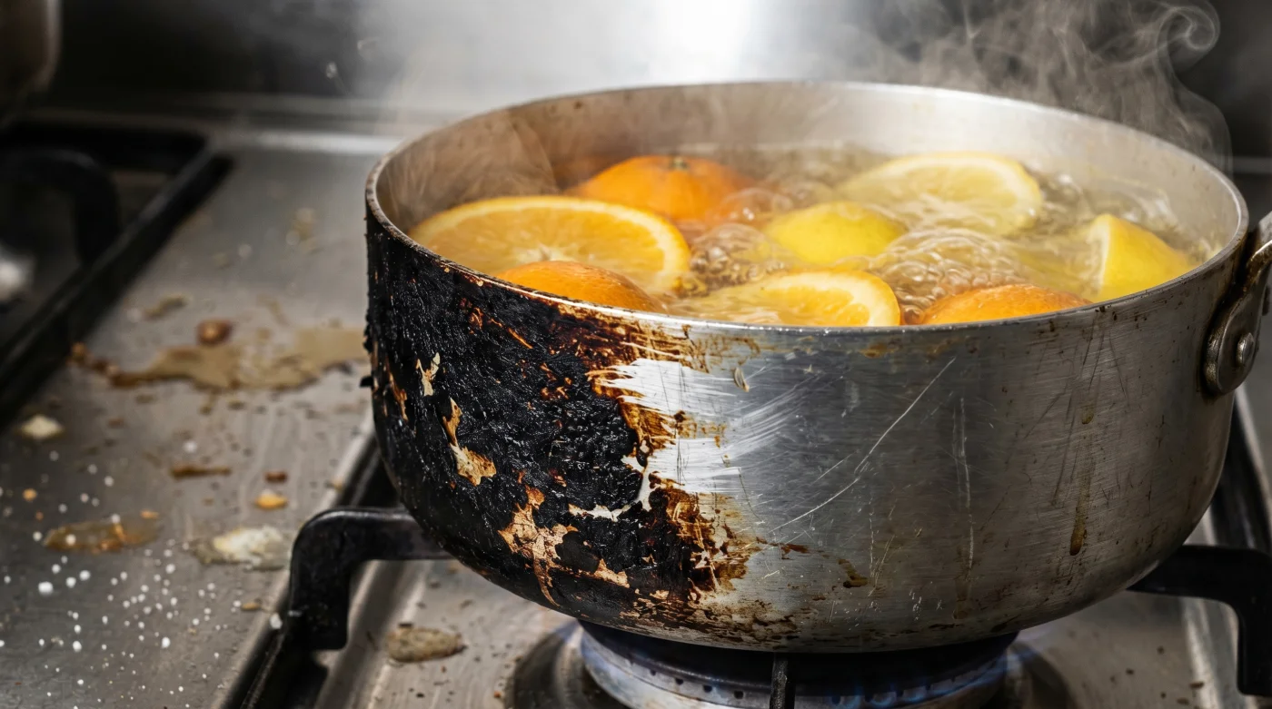 Esa llave de entrada es el ácido cítrico natural liberado por las cáscaras fibrosas de los limones, naranjas o toronjas cuando entran en contacto con el agua en punto de ebullición. Al hervir, los poros de la corteza se abren y los aceites esenciales, junto con los ácidos suaves, actúan como un bisturí a nivel molecular. Penetran exactamente en la frontera entre el aluminio limpio y la costra quemada, disolviendo los enlaces de grasa y carbón que los mantienen unidos sin comprometer el metal.