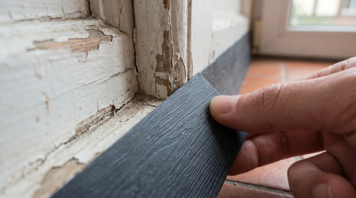 Por otro lado, si convives con perros o gatos, sabes muy bien que los bordes inferiores de la casa son su territorio de juegos. Los arañazos y mordeduras destruyen la madera natural con una facilidad asombrosa. En este escenario, necesitas recurrir al vinilo de alto tráfico. Estas cintas gruesas, a menudo reforzadas con microcapas de PVC, actúan como un escudo protector. Si una esquina sufre un daño severo con los meses, simplemente cortas el segmento afectado y pegas uno nuevo en cuestión de minutos.