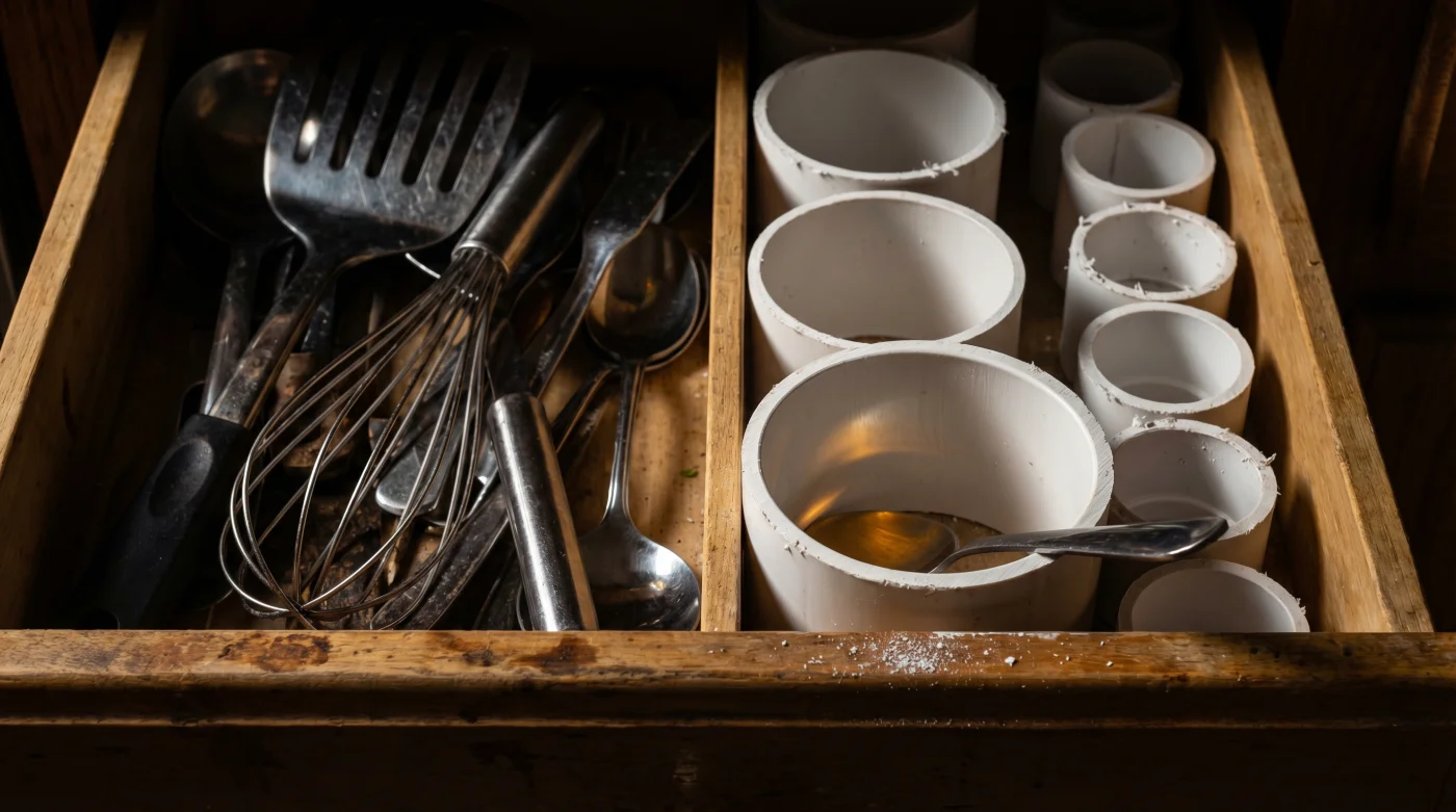 Aquí entra nuestro héroe improbable: el cilindro de policloruro de vinilo. Ese material gris o blanco rústico que suele esconderse tímidamente detrás del pañete de las paredes o bajo el sifón del lavaplatos. Cortado a la medida exacta y colocado en formación vertical, transforma un hueco inútil en un panal geométrico que parece calculado por un relojero, pero a un costo que apenas roza los precios de una ferretería de barrio.