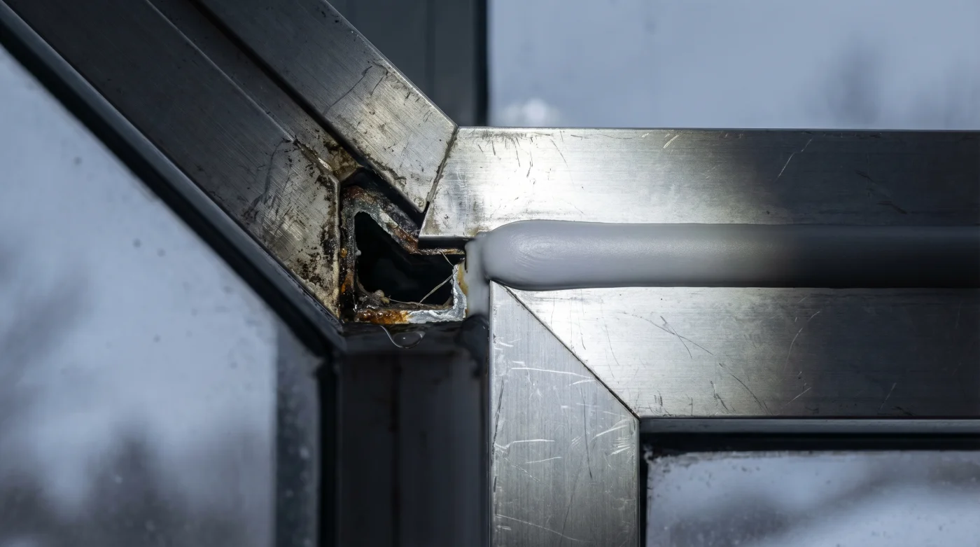 Si cierras cada milímetro de las uniones visibles, obligas a la estructura a buscar aire por su punto más vulnerable. Ese punto son las esquinas de drenaje, esas pequeñas aberturas en la base del riel diseñadas para evacuar el agua de lluvia, pero que bajo presión negativa funcionan como aspiradoras de aire helado.