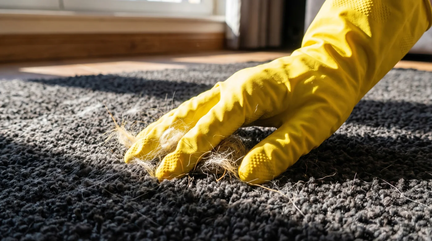 Por otro lado, si tu compañero es un golden retriever o un gato de pelo largo, te enfrentas a telarañas difusas que flotan con la mínima corriente de aire. Aquí la técnica cambia por completo. Una ligera humedad es clave. Unas microgotas de agua sobre la palma del guante actúan como un lastre para esos pelos tan livianos, evitando que salgan volando al frotarlos. Los movimientos ahora deben ser largos, continuos y en una sola dirección, barriendo desde el centro de la alfombra hacia los bordes, como si estuvieras alisando la arena de un jardín zen.