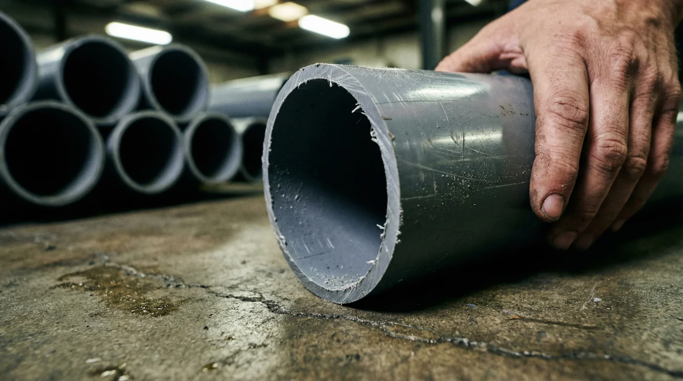 | Color sólido y uniforme sin vetas cristalinas ni manchas, lo cual es signo de buena mezcla de resina PVC pura. | Tubos que han estado expuestos al sol directo en la acera de la calle, ya que la radiación UV debilita severamente el material. |