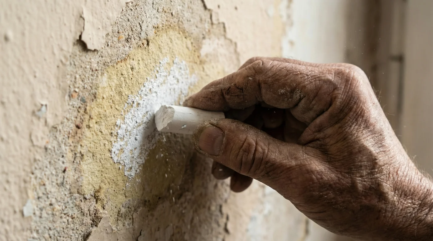 Toma tu tiza blanca y frótala con firmeza sobre toda la superficie de la mancha seca. No seas tímido con el trazo; presiona la tiza hasta que un denso polvillo blanco cubra por completo los bordes oscuros y el centro amarillento. En este momento estás levantando un muro de contención milimétrico. Luego, sopla muy suavemente o pasa un paño completamente seco sin ejercer presión. El objetivo es retirar únicamente el exceso de polvo suelto que caería por gravedad, dejando intacta esa capa adherida que ahora tapiza la porosidad de la pared.