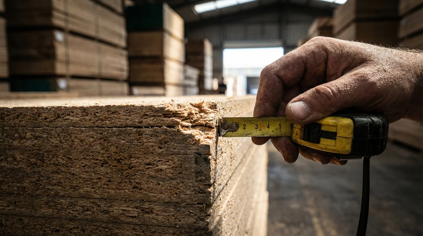 | Densidad del núcleo visible en los bordes crudos, compacto y sin grandes vacíos o porosidades. | Rastros de hinchazón o agrietamiento leve en los cantos perimetrales del tablero gigante. |