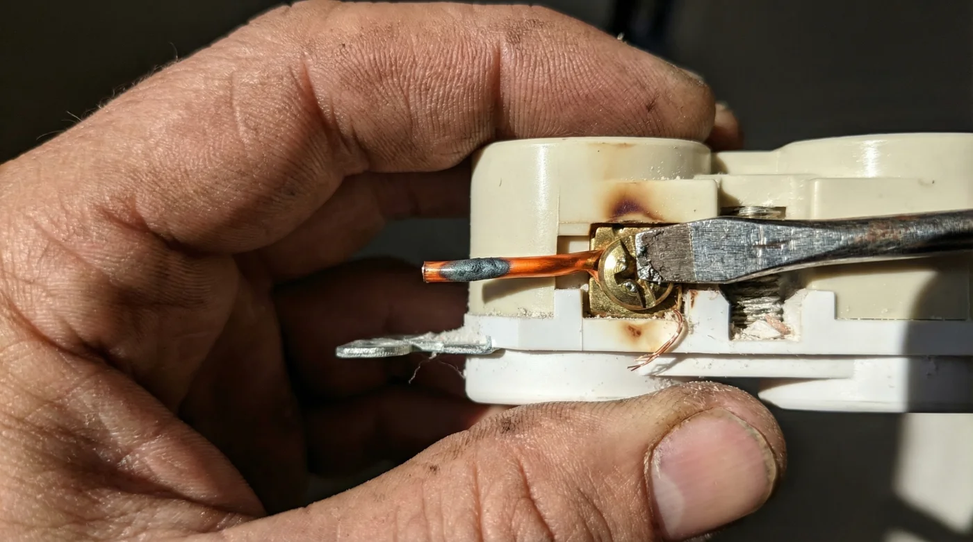 Desatornilla la placa del tomacorriente y extrae suavemente el bloque de la pared. Observa la punta del cable de cobre desnudo que entra al terminal. Si está oscura, manchada o parece rígida y quebradiza, has encontrado al verdadero culpable. No intentes simplemente apretar el tornillo sobre ese cobre enfermo; la resistencia térmica ya está creada en esa pátina negra.