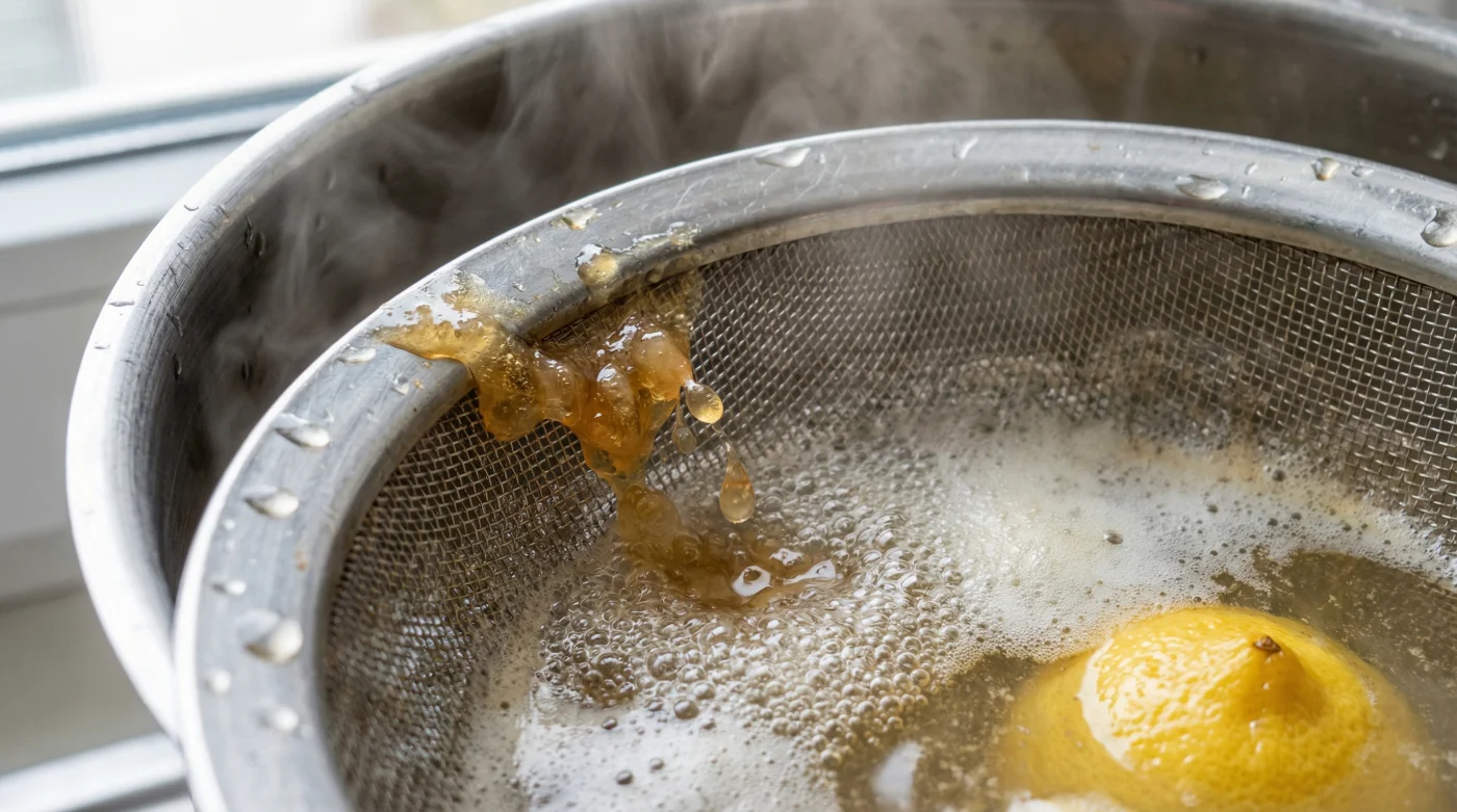 Para casos extremos, haz el proceso dos veces. En la primera ronda la costra gruesa cederá. Una segunda inmersión con agua nueva hirviendo terminará de soltar las partículas adheridas en el centro de la malla.